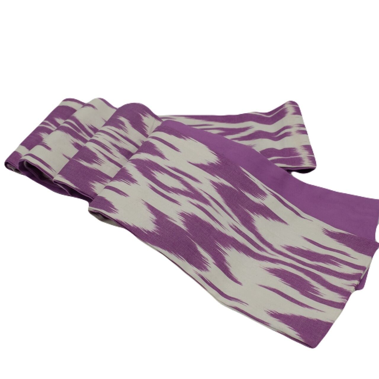 ウズベキスタンの伝統技術を生かした魅力的なイカット半幅帯です。アトラスと呼ばれるこの布地は、日本の絣と同じような手法で作られ、色鮮やかな柄が特徴です。日本の銘仙とも通じる美しさがあり、着物との相性も抜群です。この半幅帯は1本1本丁寧に手作りされており、その温かみや手仕事の魅力が感じられます。
